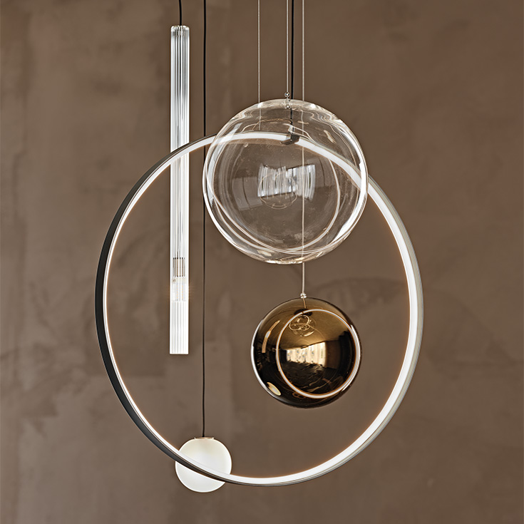 Благодаря идее Ориано Фаваретто появился Biarritz, современный потолочный светильник, напоминающий композиции форм и материалов метафизического авангардного течения. Как спутники, абажуры разных размеров и цветов притягиваются к стальной окружности, освещаемой изнутри светодиодными лампами. Другие элементы - непрозрачный стеклянный шар и стержень с каннелюрами, оживляются светом. Композиция, как будто выбранная случайно, является результатом тщательного изучения масс и объемов с целью найти идеальный баланс для этой современной лампы, способной придать комнате изысканный и ценный шарм.