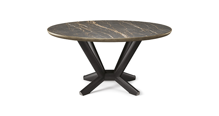 Стол с базой из стали окрашенной в гофрированный титан (GFM11), бронза (GFM18), графит (GFM69) или черный (GFM73), брашированный бронзовый или серый цвет. Верх выполнен из керамики в отделках Alabastro (KM02), Golden Calacatta opaco (KM05), Golden Calacatta lucido (KM06), Portoro opaco (KM07), Portoro lucido (KM08), Sahara Noir lucido (KM09), Makalu (KM11), Breccia (KM12), Borghini Calacatta opaco (KM18), Borghini Calacatta lucido (KM19), Colosseo (KM21), Andromeda (KM22), Invisible матовый (KM24) или Luxor (KS23) c нижним загругленным профилем, окрашенным в Brushed Bronze или Brushed Grey. Цветовые и брашировочные колебания отделки Brushed являются характерными для изготовлений ручным способом и не должны расцениваться как дефекты.