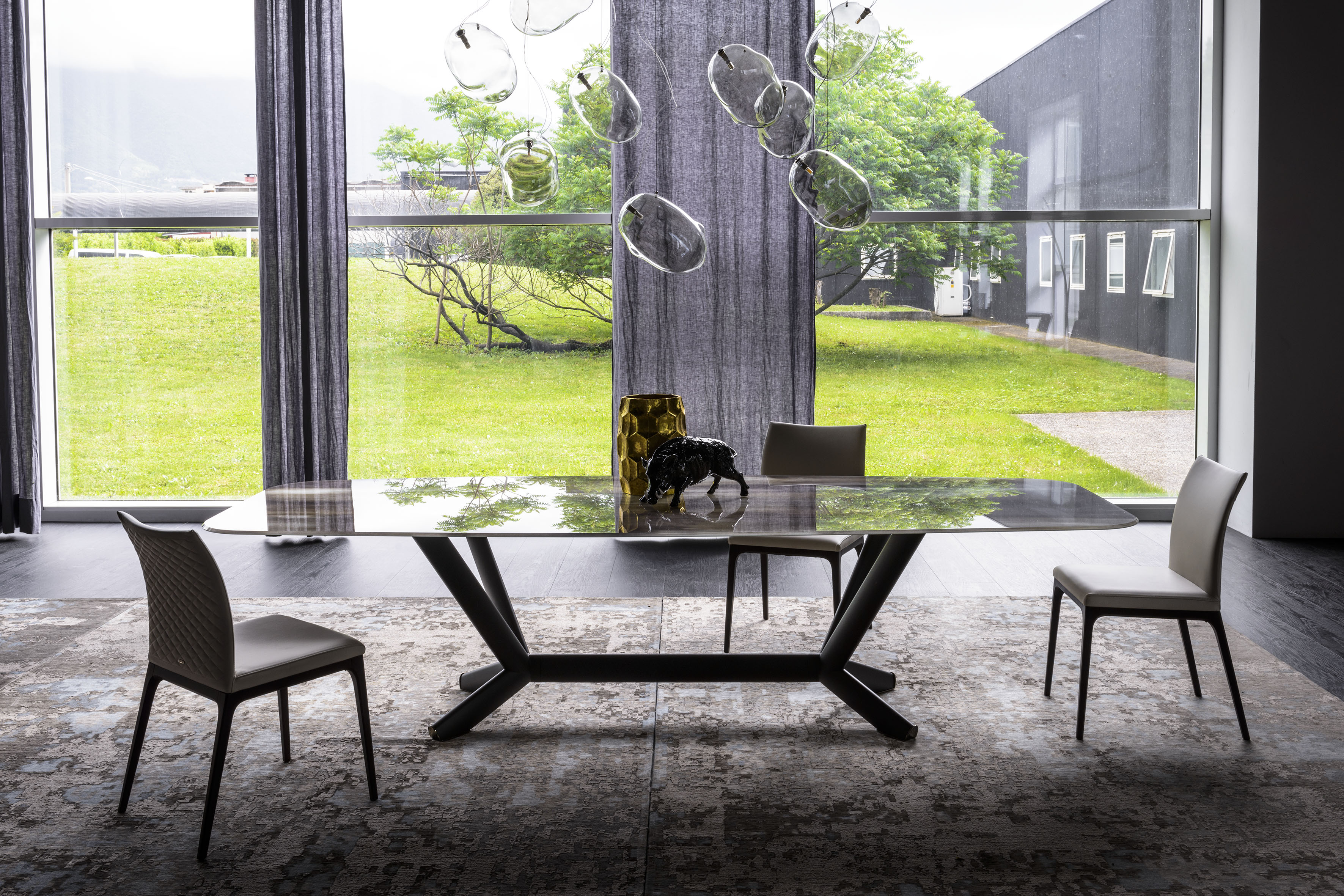 Стол с базой из стали окрашенной в гофрированный титан (GFM11), бронза (GFM18), графит (GFM69) или черный (GFM73), брашированный бронзовый или серый цвет. Топ из стекла толщиной 12мм c декоративной печатью в двух вариантах цвета (CY01, CY02).