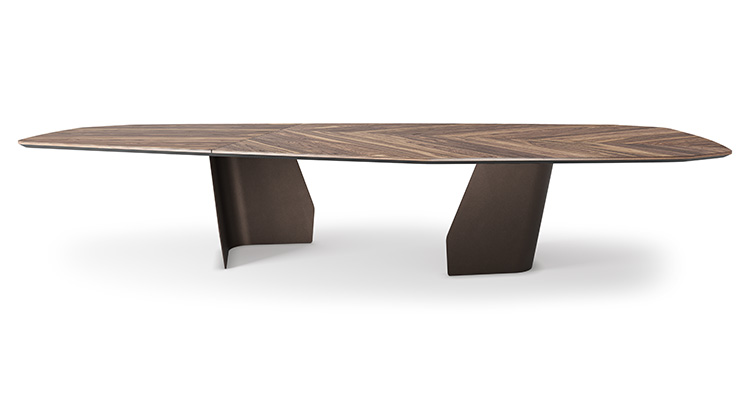 Стол с основанием из металла GFM11 гофрированная сталь, окрашенная в титан или GFM18 окрашенная в бронзу. Столешница со скошенными краями из ореха каналетто (NC) с деталями из обожженного дуба или из обожженного дуба (RB) с деталями из ореха каналетто. Столешница версии 400 см поставляется в разобранном виде на 3 части. Версия «Y»: столешница со скошенными краями из ореха Каналетто (NC) с деталями из обожженного дуба или из обожженного дуба (RB) с деталями из ореха Каналетто.