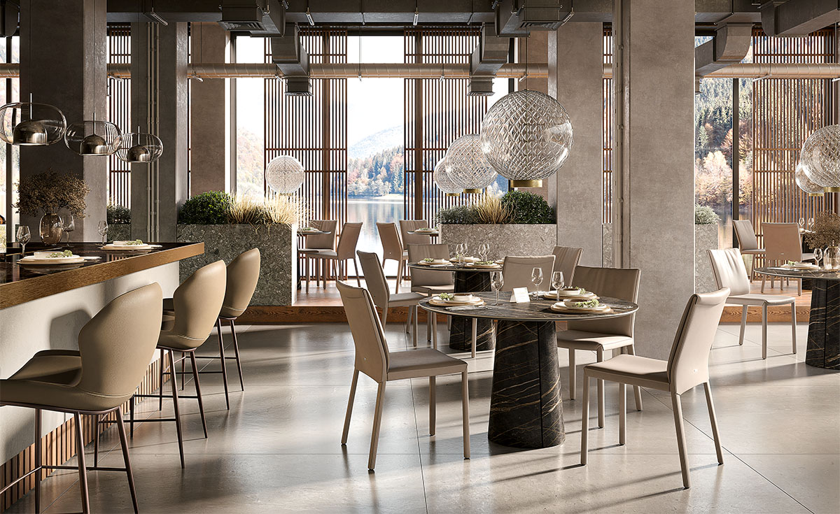 Поскольку и основание, и столешница изготовлены из того же материала, создается монолитный эффект — кажется, что изделие вырезано из ценного камня. При этом сохраняются все функциональные характеристики современной керамики. Таким образом мы получаем стол-бистро, выражающий новую эстетическую концепцию: классическая отделка, вдохновлённая красотой натурального мрамора, сочетается с уникальными технологиями производства.