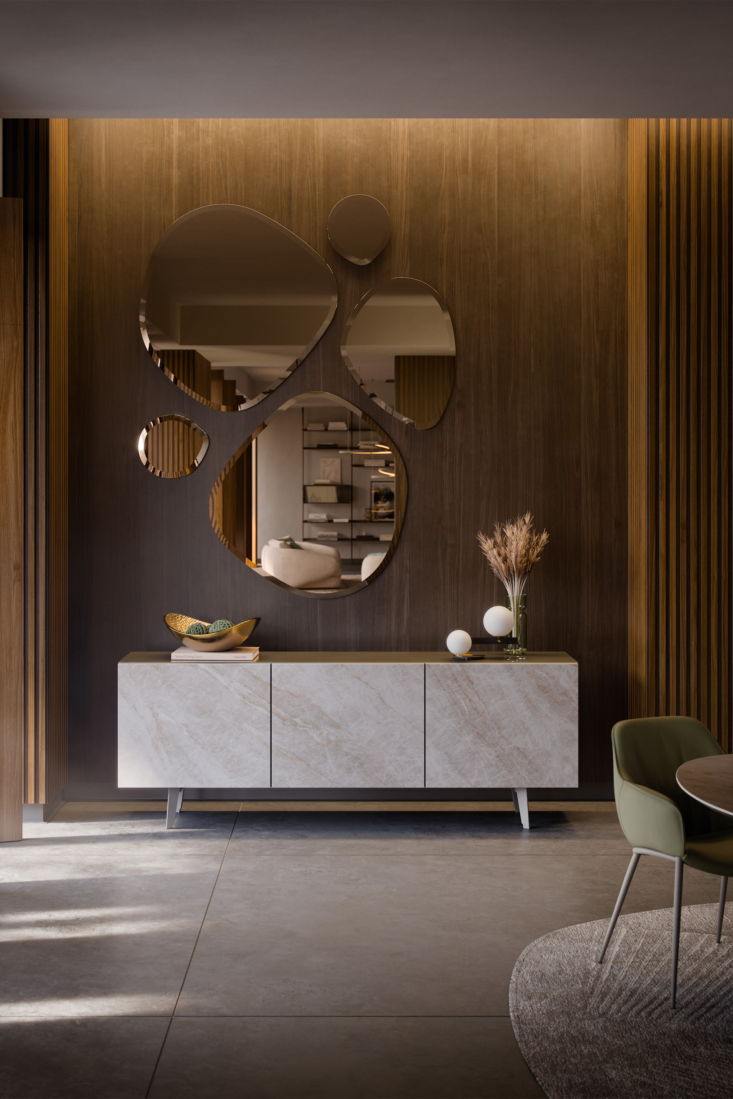 Комод Metropol со строгим дизайном задуман для элегантного оформления жилых помещений и завершения изысканных проектов дизайна интерьера, для оформления, к примеру, роскошных дизайнерских ресторанов. Этот современный комод подчеркивает облицовку дверей драгоценной керамикой Marmi, доступной во многих изысканных оттенках. Его сердце выполнено из прозрачных стеклянных полок, идеально подходящих для хранения самых дорогих предметов.