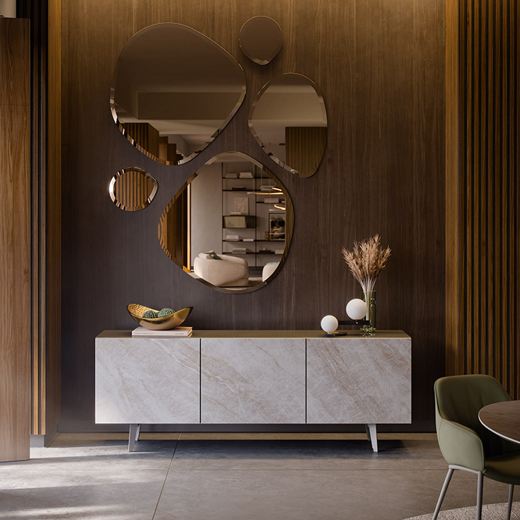 Буфет из дерева, лакированного в гофрированный графитовый (GF69), черный (GF73) или титан (М11) с базой из стали, окрашенной в цвет дерева или гофрированный титан. Дверцы в керамике под мрамор цветов: Alabastro (KM02), матовая matt Golden Calacatta (KM05), глянцевая glossy Golden Calacatta (KM06), матовая matt Portoro (KM07), глянцевая glossy Portoro (KM08), глянцевая glossy Sahara Noir (KM09), Makalu (KM11), Breccia (KM12), Corcovado (KM14), Kaindy (KM16), Borghini Calacatta матовый (KM18), Borghini Calacatta глянцевый (KM19), Colosseo (KM21), Andromeda (KM22), Invisible матовый (KM24), Taj Mahal (KM26) или Luxor (KS23) с профилем из алюминия цвета титан (GFM11). Внутренние полки из прозрачного стекла. Дополнительно возможно заказать топ в матовом стекле, окрашенного в цвет структуры. Дополнительно возможен заказ внутреннего ящика в каждой из секций.