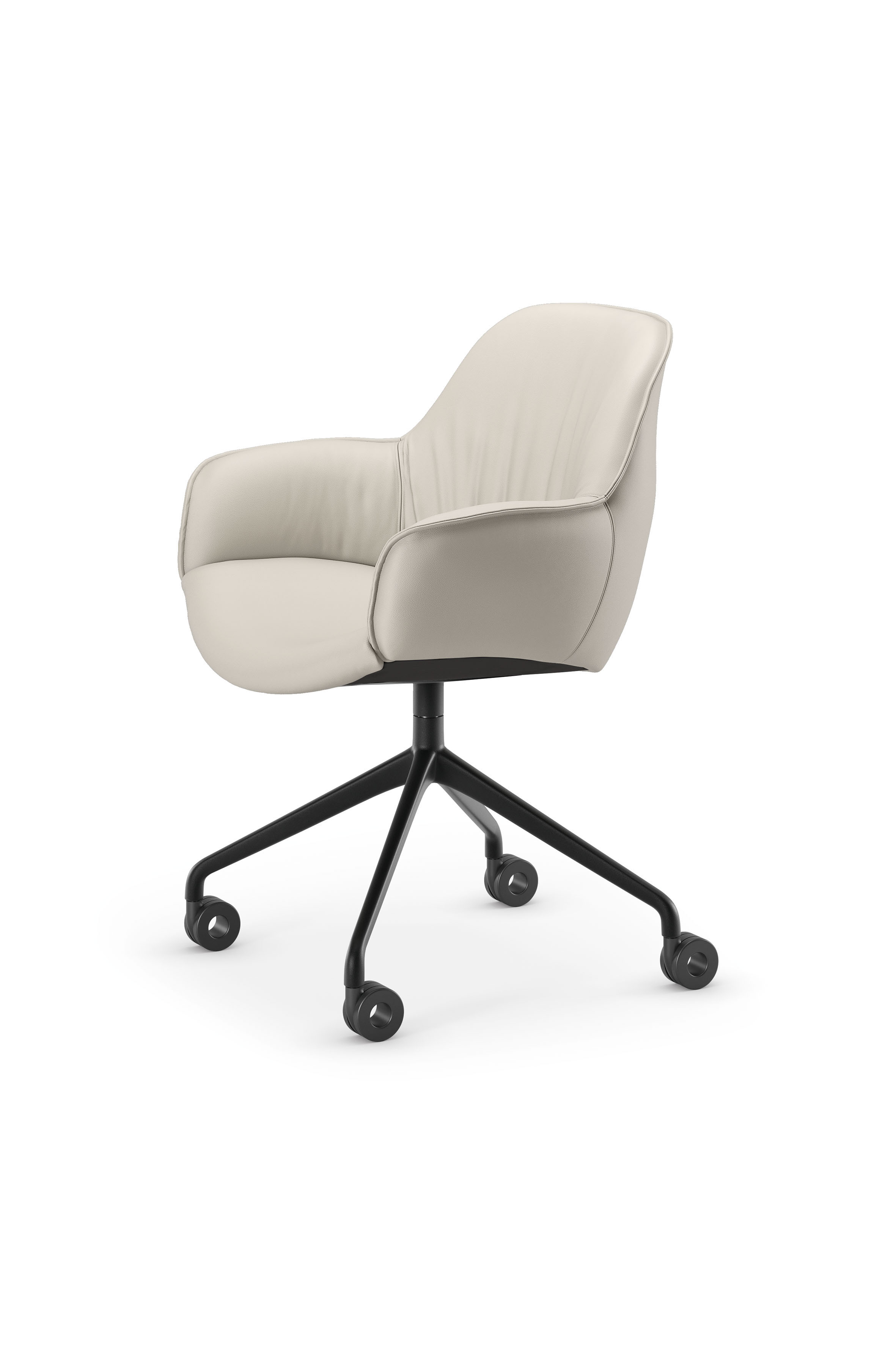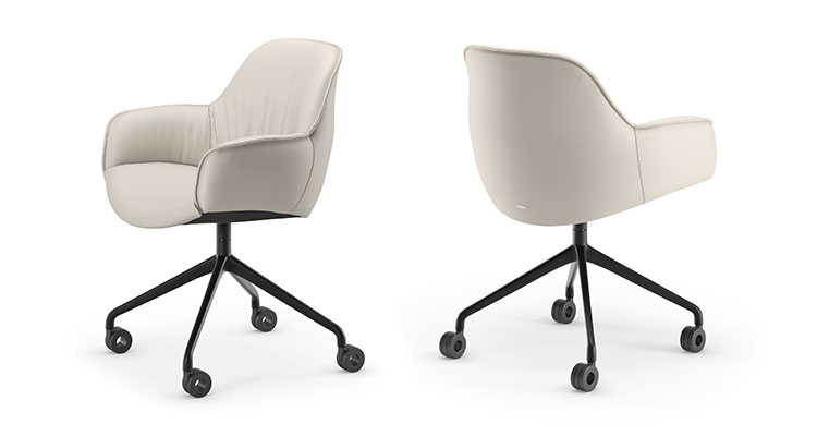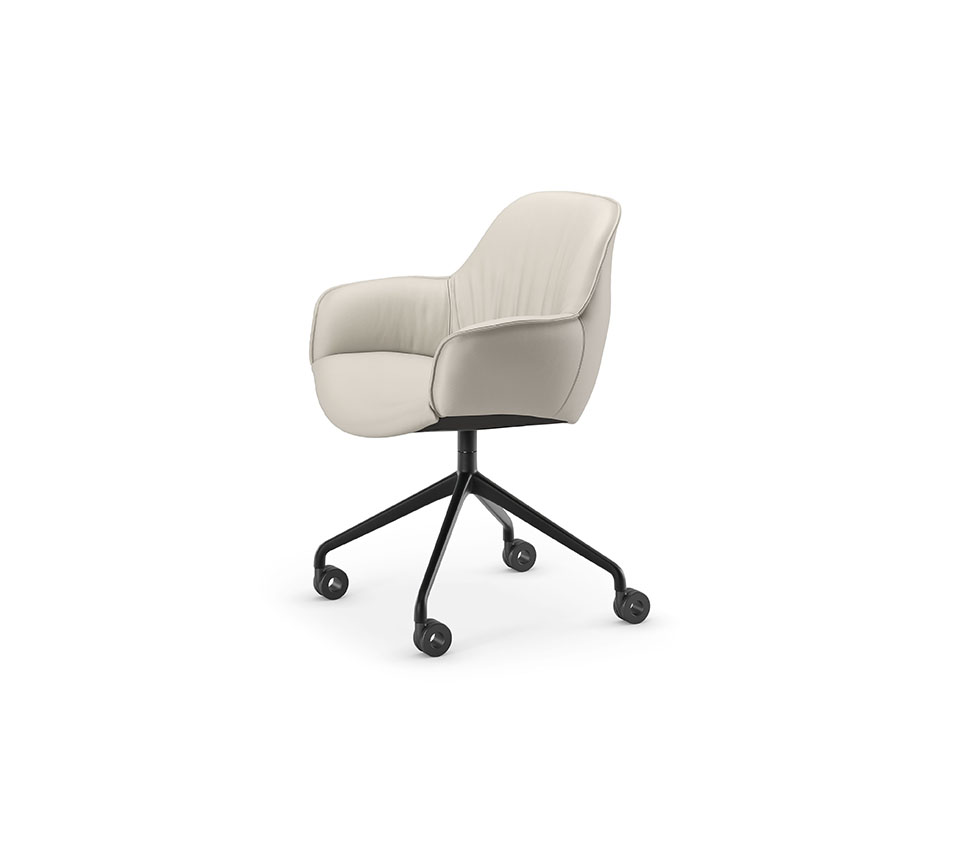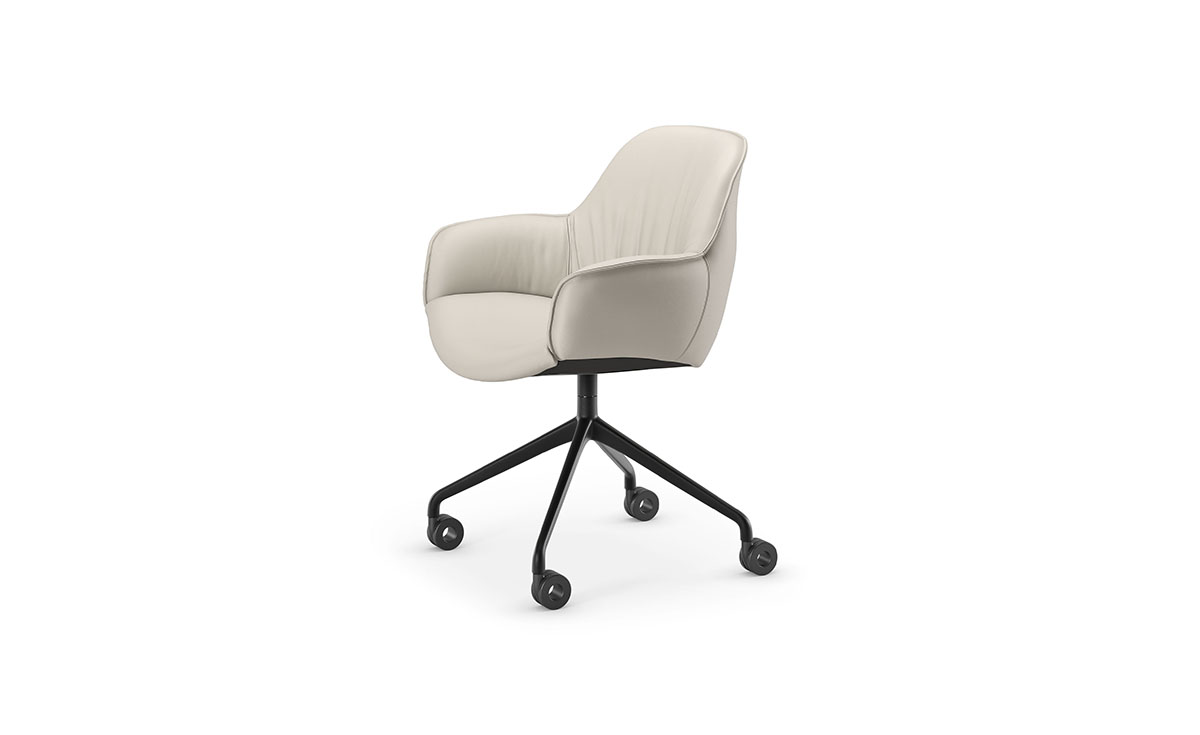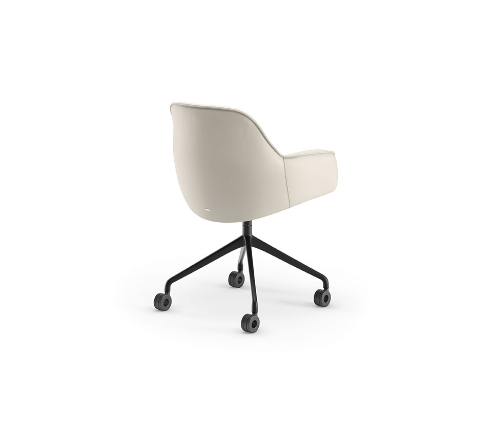 Swiveling chair with castors. 4 spokes base in titanium (GFM11), bronze (GFM18), graphite (GFM69), pearl (GFM70) or black (GFM73) embossed lacquered aluminium. Cover in fabric, micro nubuck, soft leather or synthetic leather as per sample card. The cover is not removable.