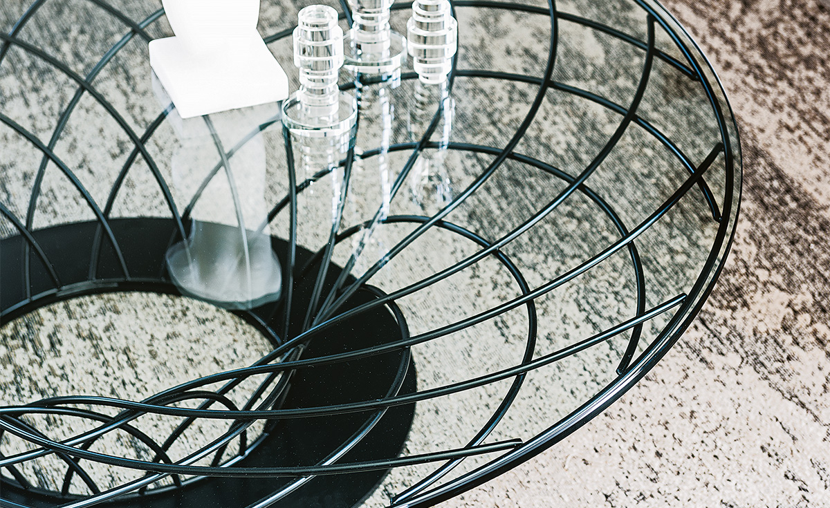 茶几的底座材质为色漆黑色漆(GFM73)或石墨色漆(GFM69)压纹钢。A和B款中,桌面材质为的黑色漆(GFM73)或石墨色漆(GFM69)压纹钢。C款中桌面材质为的透明玻璃。玻璃桌面在底座上。