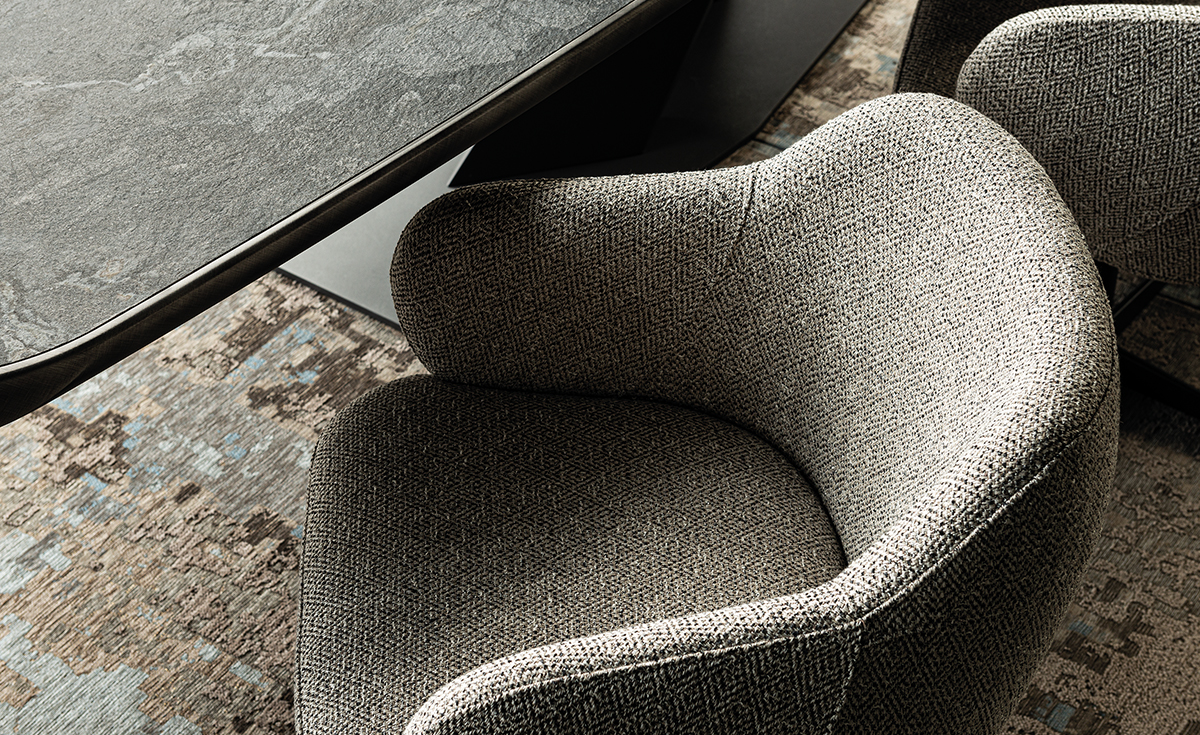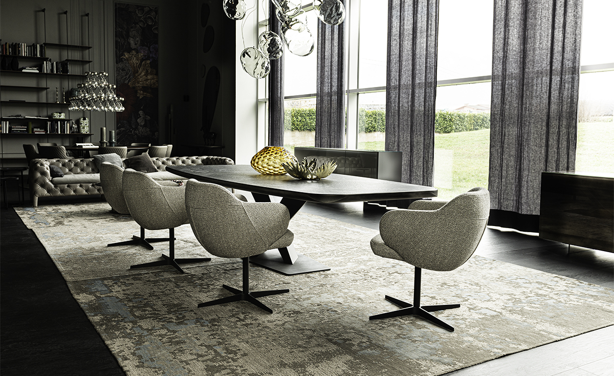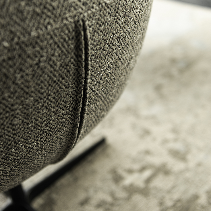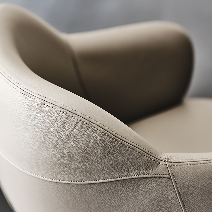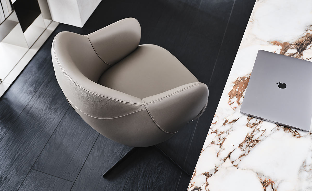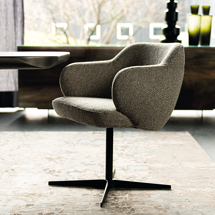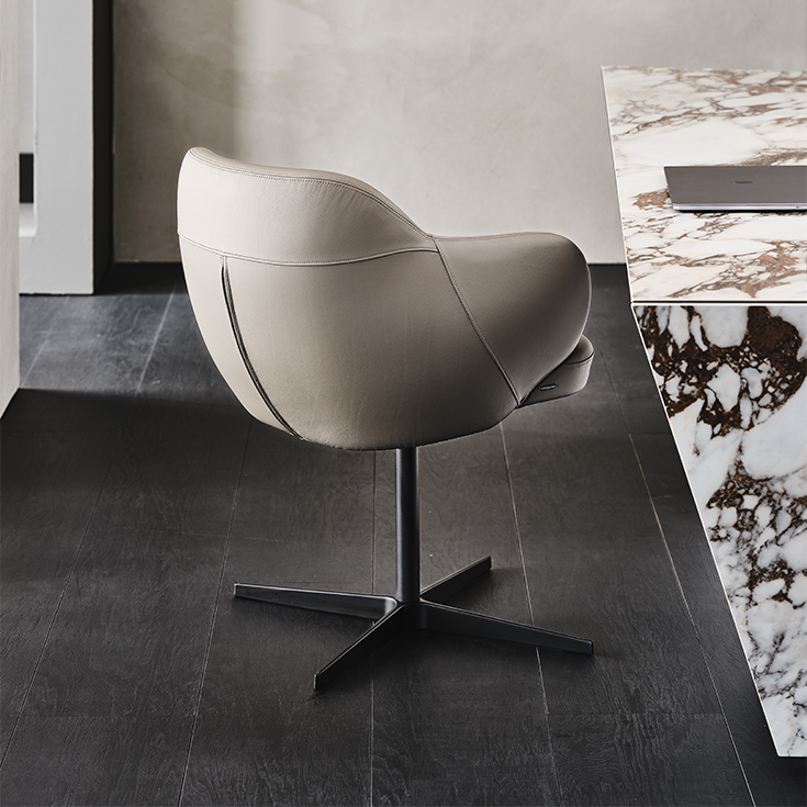 Swiveling chair with 4 spokes base in titanium (GFM11), bronze (GFM18), graphite (GFM69) or black (GFM73) embossed lacquered steel. Seat and back upholstered in fabric, synthetic leather or soft leather as per sample card. The cover is not removable.