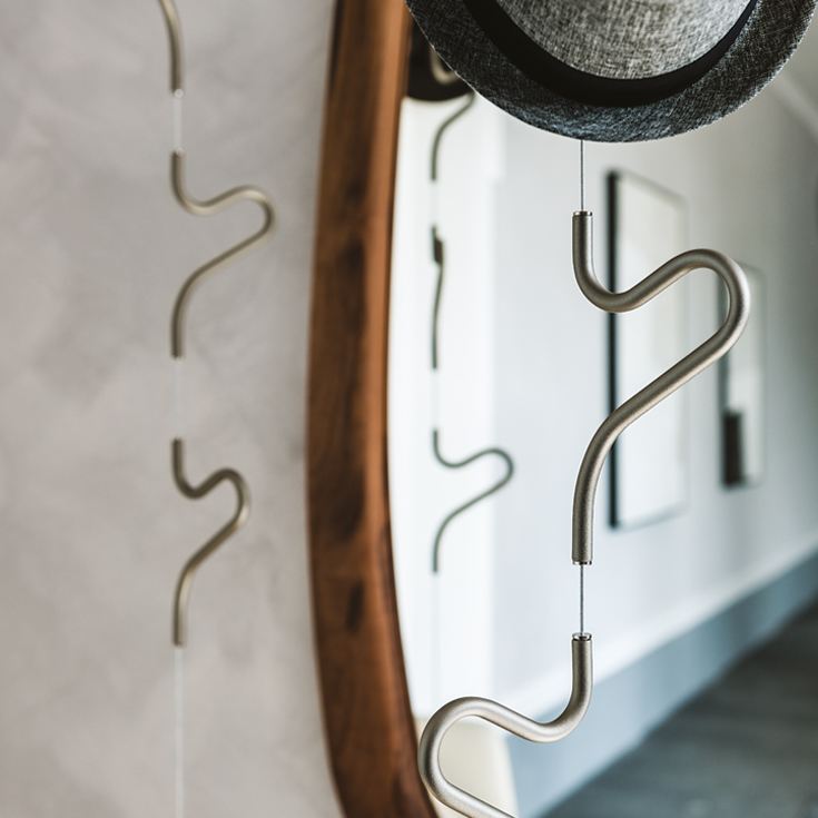 透视景观的Air悬挂衣架是一款现代家具附件,为环境赋予独创性。设计师Toso和Quaggioto构思了一条固定在天花板上的钢缆,附带五个可用作衣帽钩的旋转弯曲组件。在摆件的底部固定有一个钢制圆柱体,可以让悬挂的物品保持稳定和精致感。这款奇特的设计衣架适用于装饰起居空间、卧室或衣橱。这个附件亦可用于室内设计承包项目当中,在设计餐厅或精致更衣室的入口处为宾客带来一丝惊喜感。
