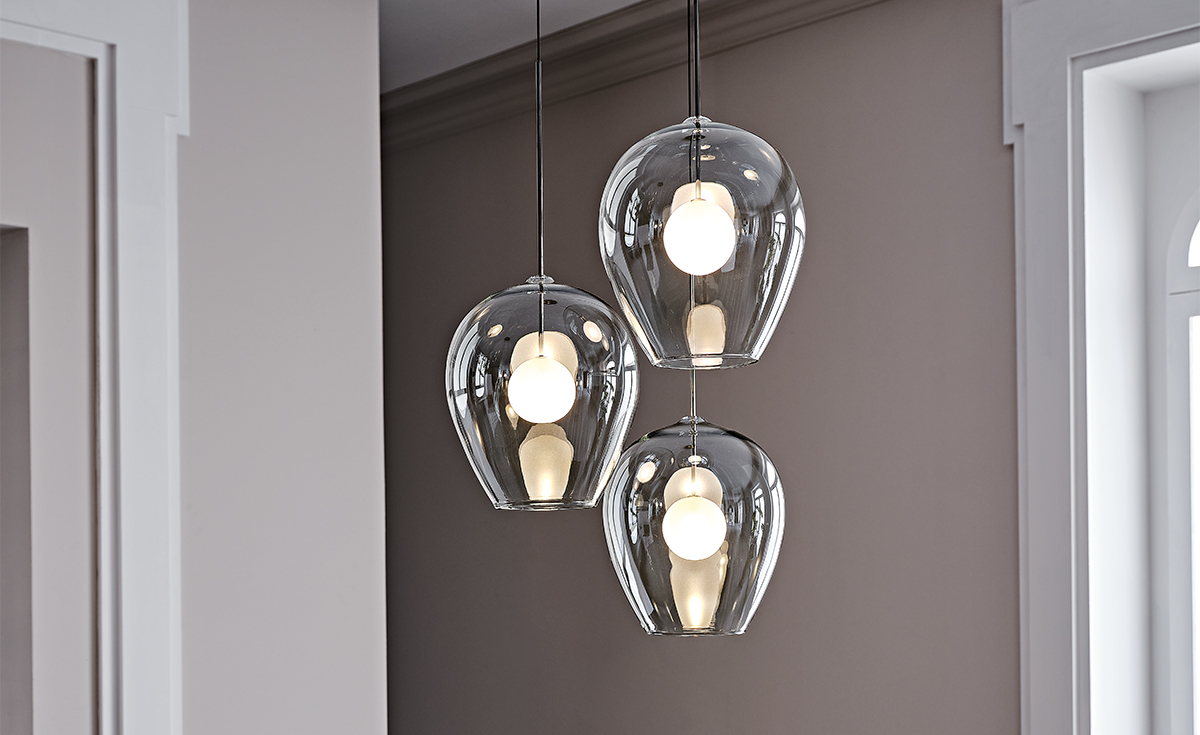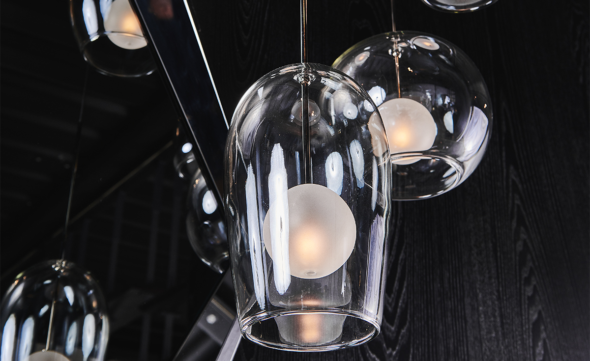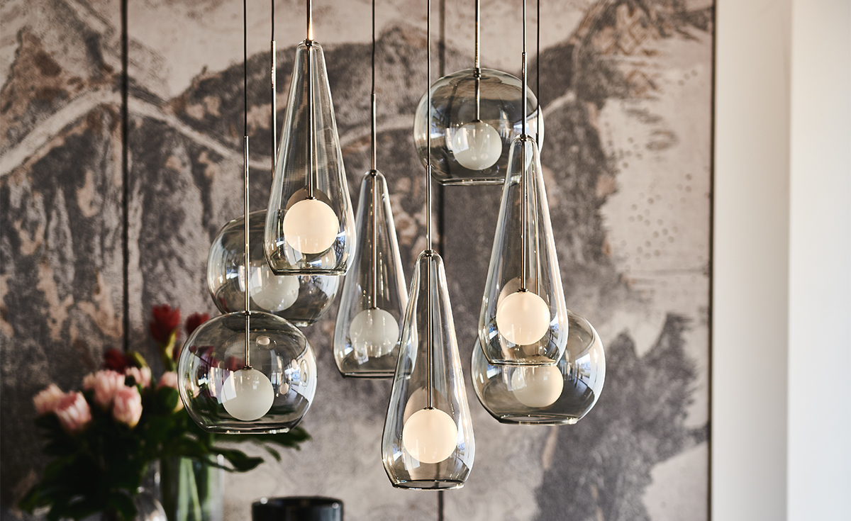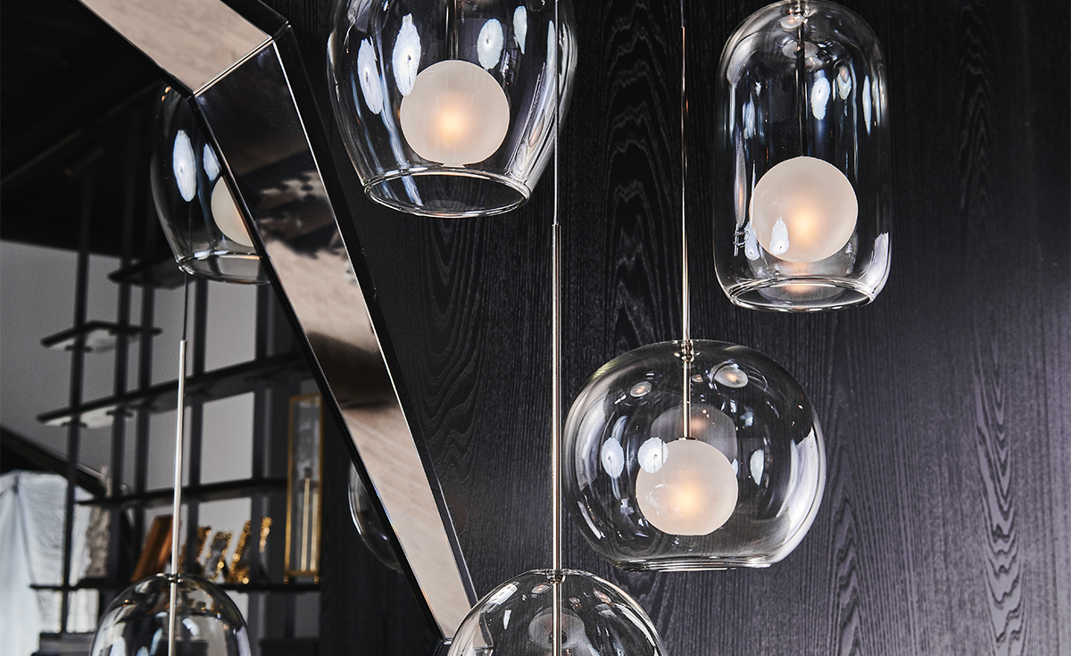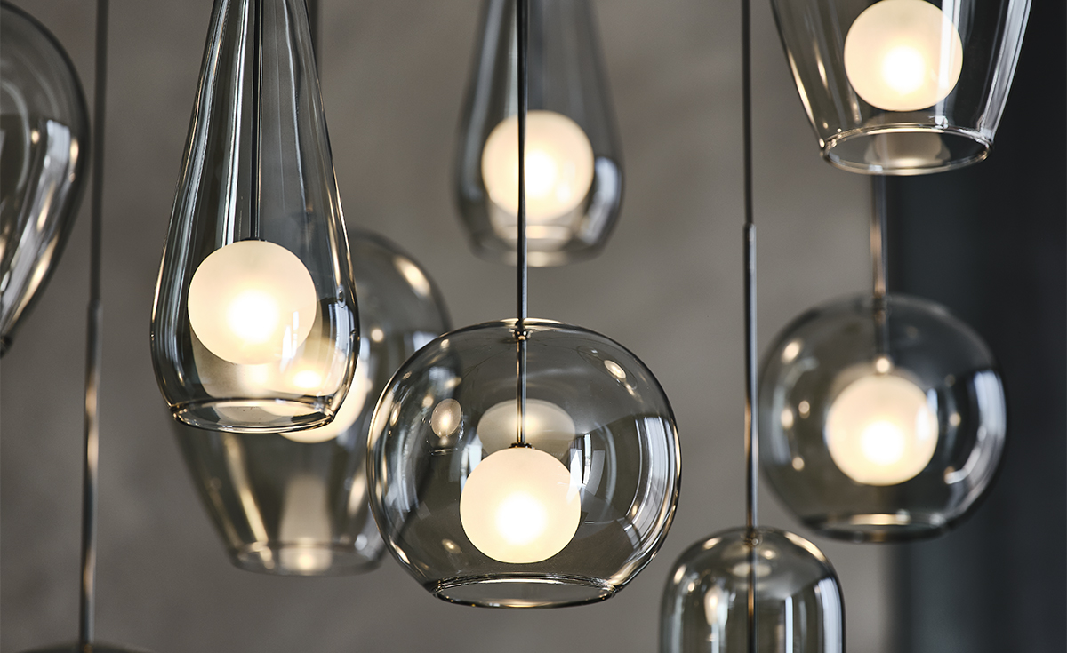 吊灯灯罩材质为烟熏色玻璃。灯盘材质为黑色镀铬钢(06)。S2/12:适用于2到12个灯罩的圆形灯盘。包含灯泡。