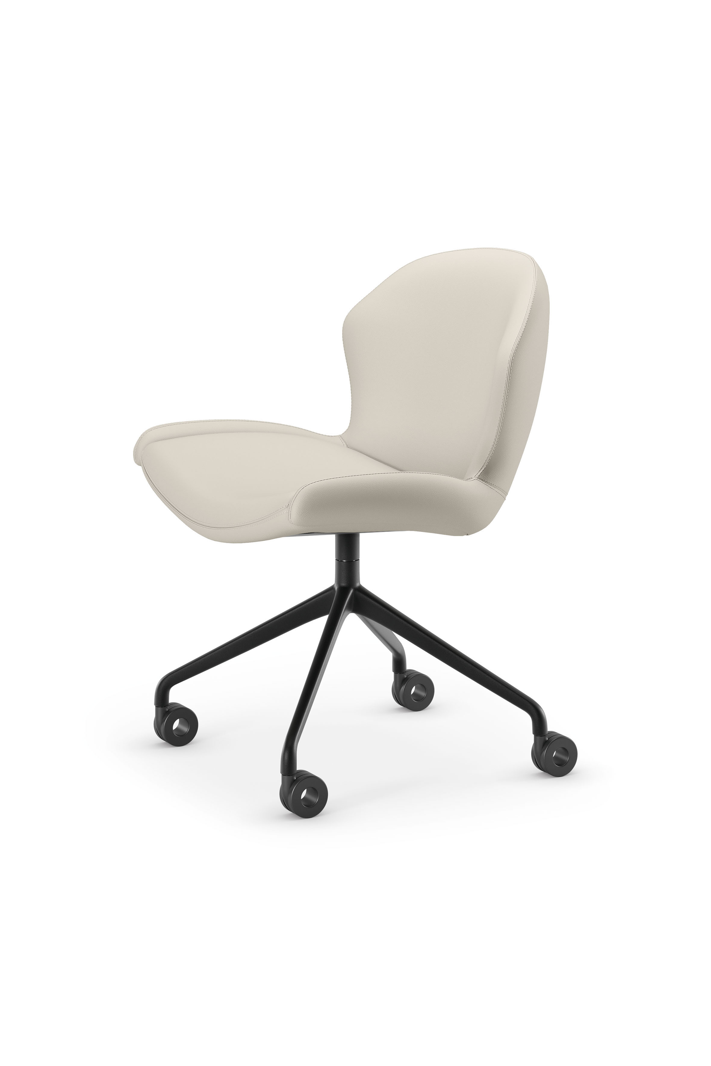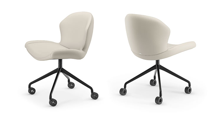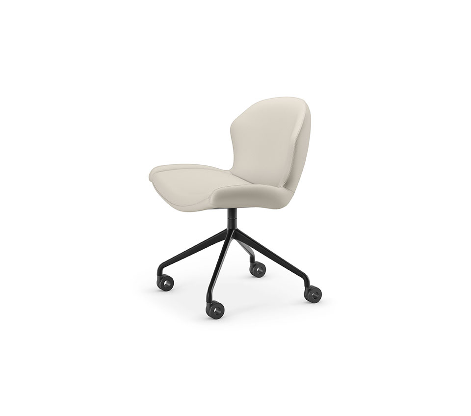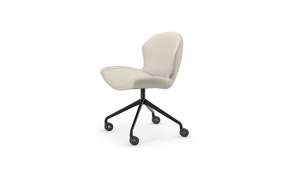 Swiveling chair with castors. 4 spokes base in titanium (GFM11), bronze (GFM18), graphite (GFM69), pearl (GFM70) or black (GFM73) embossed lacquered aluminium. Cover in fabric, micro nubuck, soft leather or synthetic leather as per sample card. The cover is not removable.