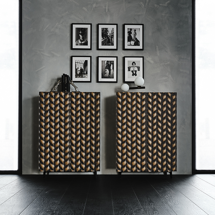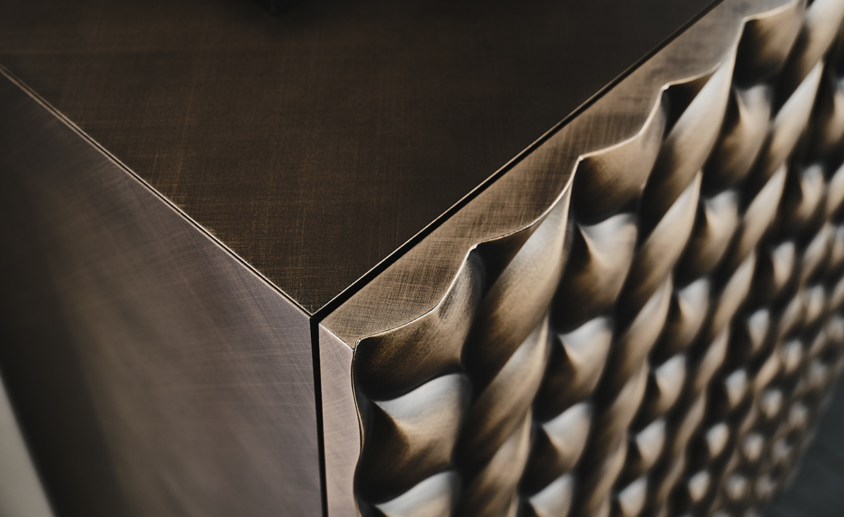 木制边柜,可选石墨色(GF69)拉丝铜色或拉丝灰色。石墨色(GFM69)或黑色(GFM73)不锈钢柜脚。内部有部分镜面和烟熏玻璃架子。可选:内部LED灯套件。。
